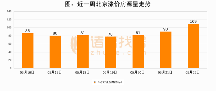 根据诸葛找房数据显示,北京24小时涨价房源量为109套,较05月21日增加19套,环比上涨21.1%。与此同时,涨价房源占比小幅扩大,业主信心有所提升。