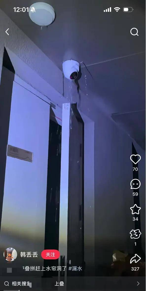 海淀永丰北均价8.3万/平的某新房漏水漏成水帘洞,中间层都在漏水;