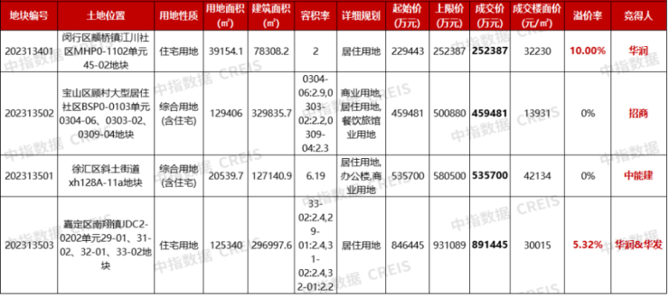 本次出让的4宗宅地,涉及徐汇区、宝山区、嘉定区、闵行区四个区。其中2宗地块仅有招商蛇口和中能建报名,提前锁定战局。另外2宗地块均被华润置地斩获,其中华润置地以25亿元竞得闵行颛桥宅地,华润置地与华发联合体以89.1445亿元竞得嘉定南翔地块。