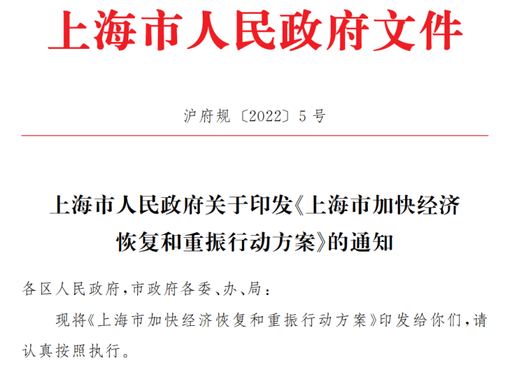 5月29日,上海市人民政府印发《上海市加快经济恢复和重振行动方案》(以下简称《方案》)提出,千方百计为市场主体纾困解难、有序推进复工复产复市。
