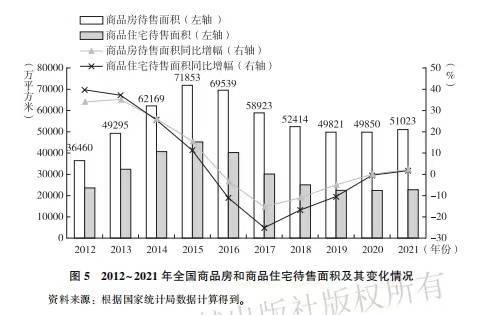 数据显示,2021年全国商品房待售面积为5.10亿平方米,比2020年增长了2.4%。其中,住宅待售面积为2.28亿平方米,占44.7%;办公楼待售面积为0.38亿平方米,占7.5%;商业营业用房待售面积为1.28亿平方米,占25.0%。从2015年全国商品房待售面积创下7.19亿平方米的历史高点后,商品房待售面积开始逐年减少,直至减到2019年的4.98亿平方米;2020年全国商品房待售面积比2019年增长了0.2%,增至4.99亿平方米,但商品住宅待售面积仍小幅减少;2021年商品住宅待售面积增幅由负转正,出现了自2016年以来的首次增加,全国商品房待售面积增幅也较2020年的增幅有所扩大。