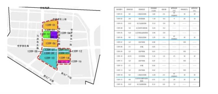 1309街区地块,包含3块住宅用地、1块中学用地,还有体育用地、停车场用地和防护绿地,住宅容积率2.5/2.6。