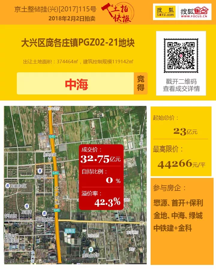 搜狐焦点讯:大兴区庞各庄镇PGZ02-21地块,被中海以32.75亿斩获,溢价率42.3%,综合楼面价27488元/平;