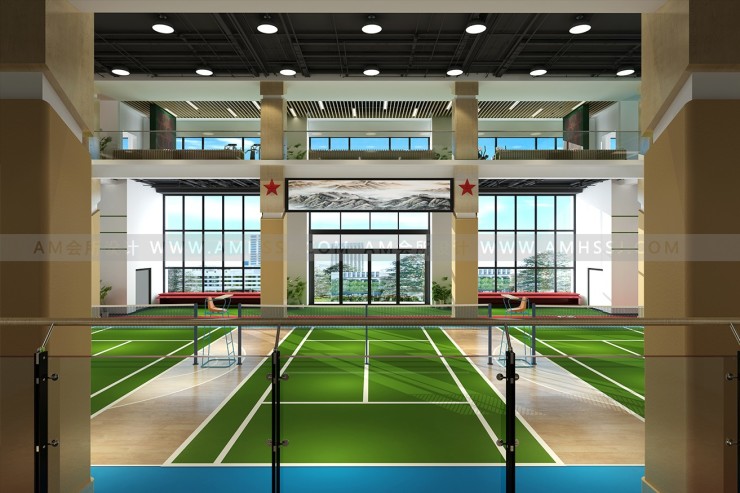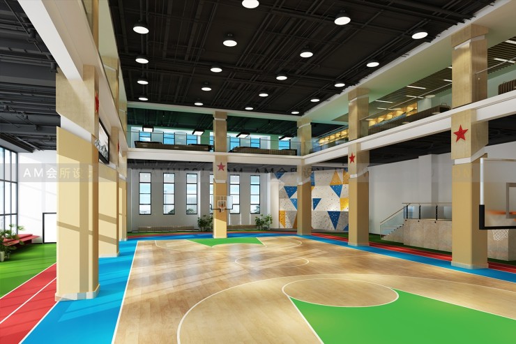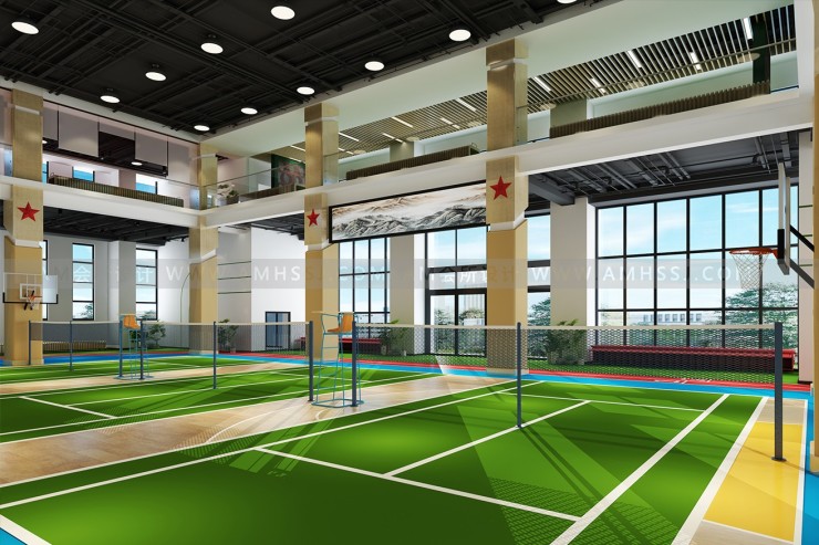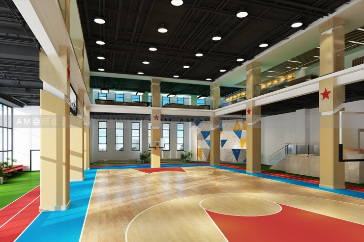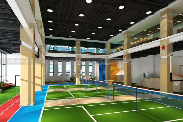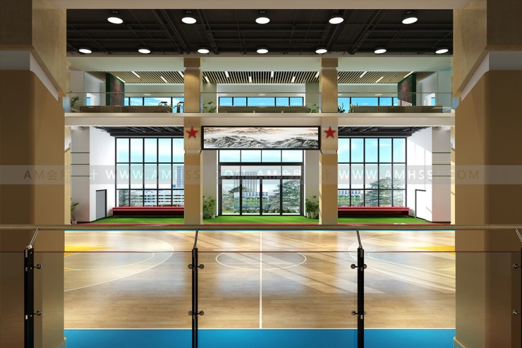 设计说明:六一零·八一部队设计以干净、大气、明亮,体现部队文化。为了提高官兵身体综合素质,以发展、增强身体健康、丰富文化生活为目的身体活动,将部队院内北侧建筑作为提高官兵身体综合素质运动馆,现将室内运动馆进行装修设计,面向社会选择有运动场馆设计,一层主要功能:篮球场、羽毛球场、乒乓球等大运动量的动态