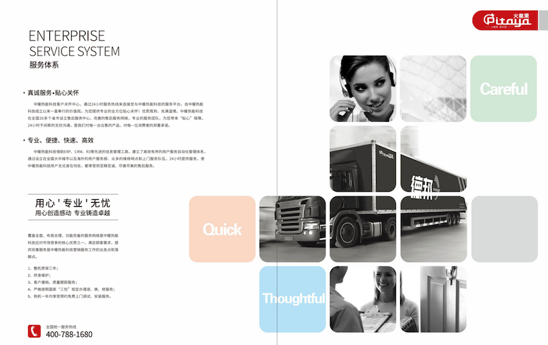 服务方面,成立了中暖热能科技客户关怀中心,通过24小时服务热线来连接客户和中暖热能科技的服务平台,同时,公司在全国30多个省市设立售后服务中心,完善的售后服务网络,专业的服务团队,为客户带来“贴心”、“迅速”、“真诚”的服务体验。覆盖全面、布局合理、功能完备的服务网络是中暖热能科技应对市场竞争的核心优势之一,为此,中暖科技提出以下具体的服务方案:1、整机质保三年;2、终身维护;3、客户建档,质量跟踪服务;4、严格按照国家“三包”规定办理退、换、修服务;5、购机一年内享受预约免费上门调试、安装服务。