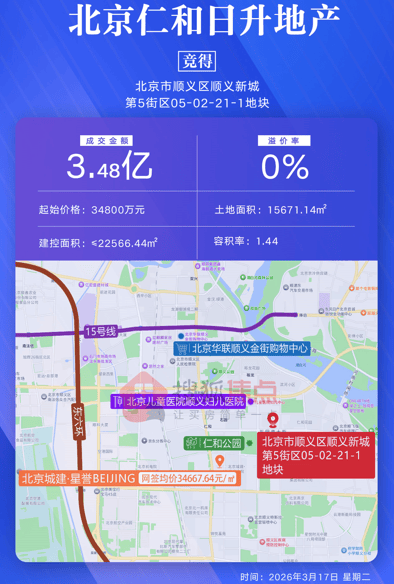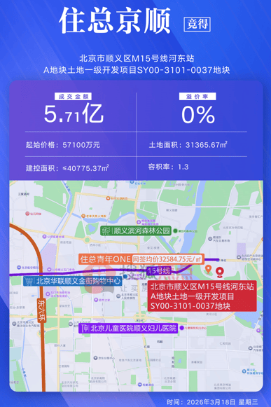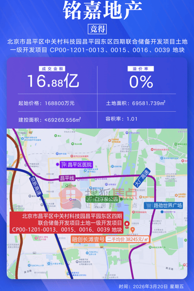 开年以来,北京土拍市场迎来阶段性发力,上周三宗优质宅地集中出让,均以底价顺利成交,为2026年北京土拍市场注入暖意。3月17日北京仁和日升房地产有限公司成功竞得顺义新城第5街区05-02-21-1地块,成交总价3.48亿元,折合楼面价15421元/㎡。次日,北京住总京顺房地产开发有限公司再下一城,以5.71亿元底价摘得顺义区M15号线河东站A地块,两宗顺义地块直线距离仅5公里。3月20日,中关村科技园昌平园东区四期地块顺利出让,铭嘉地产(实际控制方为昌平区国资委)独家报名,以16.88亿元底价竞得,三宗地块的顺利成交,彰显了市场对北京核心区域宅地的稳定预期。