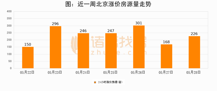 根据诸葛找房数据显示,北京24小时涨价房源量为226套,较05月27日增加58套,环比上涨34.5%。与此同时,涨价房源占比小幅扩大,业主信心有所提升。