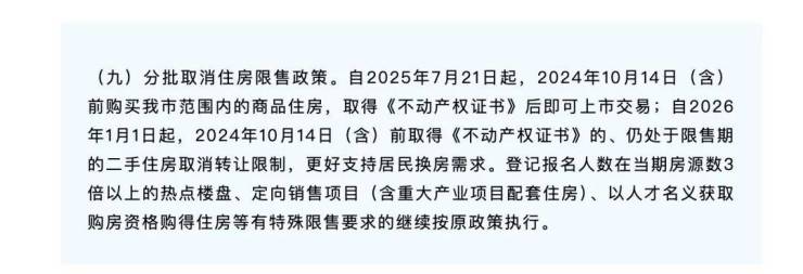 根据《通知》,自2025年7月21日起,2024年10月14日(含)前购买的商品住房,取得《不动产权证书》后即可上市交易;自2026年1月1日起,2024年10月14日(含)前取得《不动产权证书》的、仍处于限售期的二手住房取消转让限制,更好支持居民换房需求。