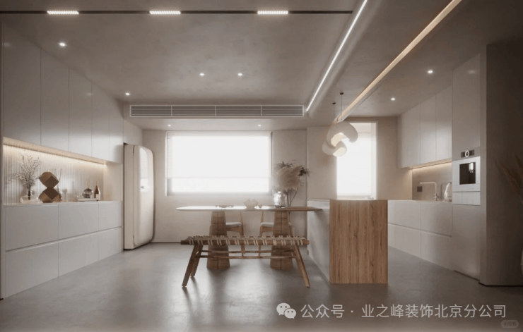 ✅餐厅:吊顶与梁的衔接处做了磨圆处理,整个空间色调柔和轻快,没有一丝多余的装饰。