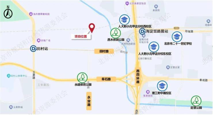 半壁店0003、0004地块位于田村路街道,地处北四环与五环之间,东侧临近西四环城市快速路与轨道交通站点地铁6号线五路居站及田村站;南侧临近永建体育公园。