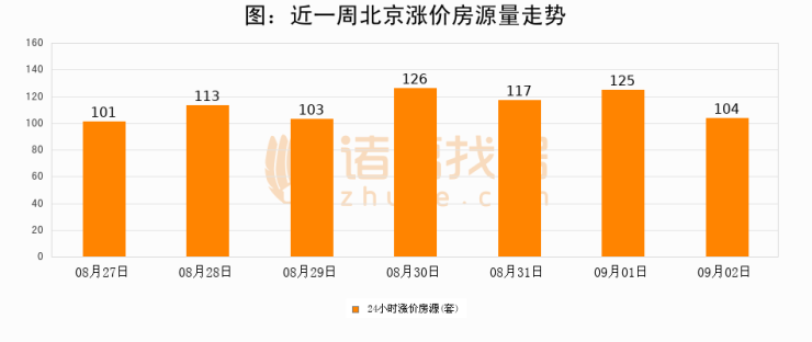 根据诸葛找房数据显示,北京24小时涨价房源量为104套,较09月01日减少21套,环比下降16.8%。与此同时,涨价房源占比小幅回落,对于购房者来说是一个入市窗口期,购房者可抓住时机入市。