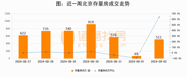 从存量房来看,2024年09月02日北京存量房单日成交511套,比昨日增加442套,环比上涨640.6%。从近一周存量房成交来看,北京存量房日均成交套数为596套,09月02日单日成交511套,低于近一周平均水平14.3%。