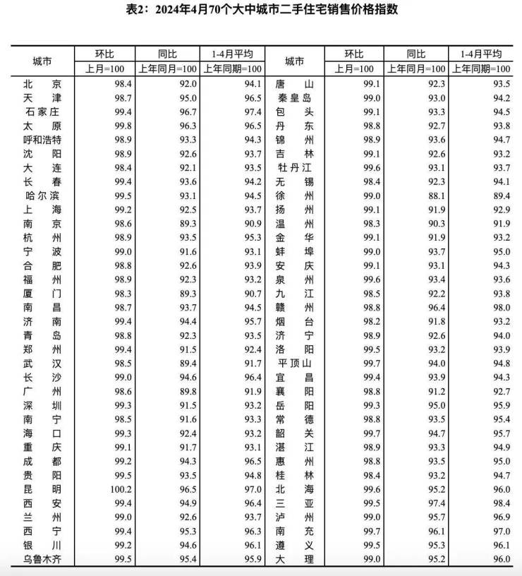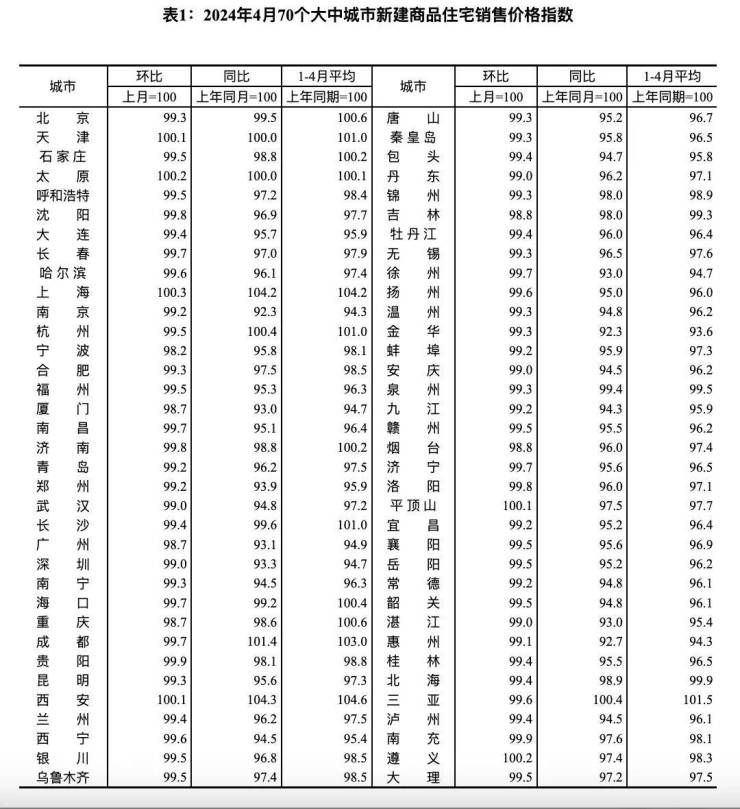 根据统计局数据,4月份70个大中城市中,各线城市住宅销售价格环比、同比均下跌。