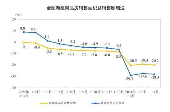 比如1-4月份,新建商品房销售面积29252万平方米,同比下降20.2%,其中住宅销售面积下降23.8%。