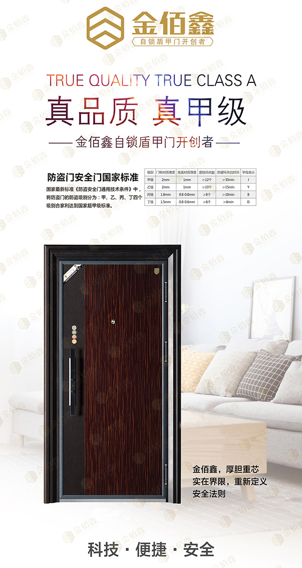 金佰鑫自锁盾甲门,所有的产品均为甲级防盗门,品质保证,假一罚十。