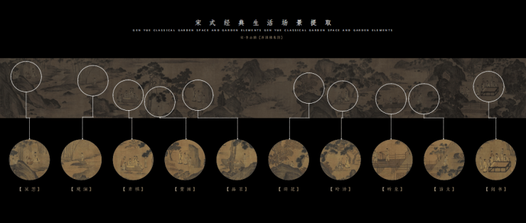 提取宋代文人偏爱的雅趣生活场景“冥想、观澜、弈棋、赏画、品茗、莳花、吟诗、听泉、访友、阅书”呼应艮岳中的十景生活意趣,雅著“御品门庭、松风观澜、介亭临瀑、溯溪品茗、拙石雅苑、杏岫莳花、宫廊聆泉、坐忘听枫、林道浇书、幽篁竹影”十重景观,营造当代西贤与古代贤士的对望共鸣。