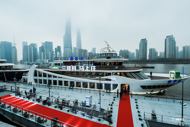 当天晚上,三棵树与来自全球的VIP客户、合作伙伴、投资机构等300余位重要嘉宾一起,相聚在“三棵树号”豪华游轮上,共同参加了“今夜,上海滩为三棵树点亮”的品牌游船活动,共同见证了三棵树冠名豪华游轮及上海外滩地标震旦大厦巨屏三棵树品牌广告的启动,这成为了上海外滩,以及整个涂料行业当晚的焦点。