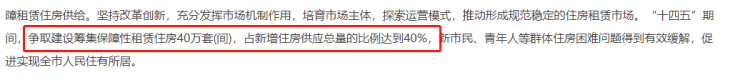 《方案》中提到,“十四五”期间,要争取建设筹建保租房40万套(间),占新增住房供应总量的40%。
