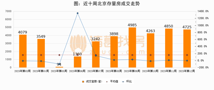 存量房方面,第12周北京存量房成交4725套,较上周减少125套,环比下降2.6%。从近十周成交走势来看,周均成交套数为3504套,本周高于平均水平34.8%。
