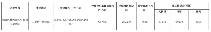 具体而言,海珠区琶洲南区AH090402地块宗地面积32965平方米,计算容积率建筑面积67638平方米,挂牌起始价287462万元,折合起始楼面价42500元/平方米。