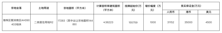 海珠区琶洲南区AH090403地块宗地面积17283平方米,计算容积率建筑面积36223平方米,挂牌起始价155759万元,折合起始楼面价43000元/平方米。
