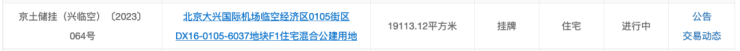大兴国际航空社区6038地块,仅新航城1家房企报名,最终以5亿元底价成交;