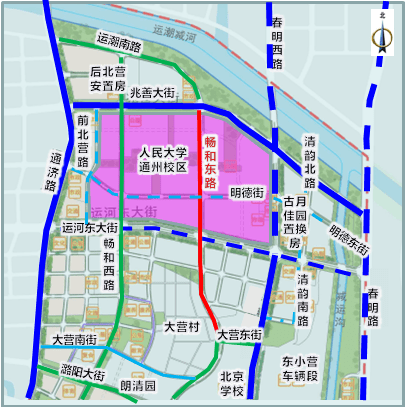 在本次批复的4条道路中,畅和东路是中国人民大学通州校区的配套道路工程。项目南起大营东街,北至兆善大街,全长约1.5公里,按照城市次干路标准建设,设置双向四车道,红线宽40米。