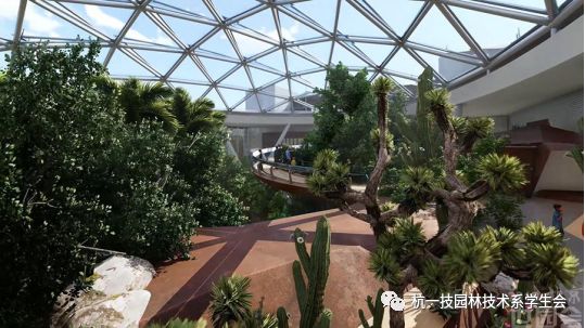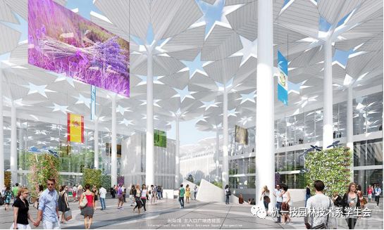 此外,国际馆利用建筑遮阳、自然通风、太阳能光伏发电、蒸发冷却降温、滴灌技术和雨水回收利用等可持续技术,成为一座绿色、环保的低能耗建筑。外立面采用玻璃幕墙,并在顶面设计了天窗,较大限度保证场馆的自然采光和通透性。花伞的立柱可将收集屋面雨水,使其渗入蓄水池,当雨水过多时,将会流入排水沟,用于景观用水、绿化用水、路面冲洗等。在花伞的上方采用新型光伏发电材料,提高光伏发电效率,用于整个建筑的内照明、动力等用能需求。
