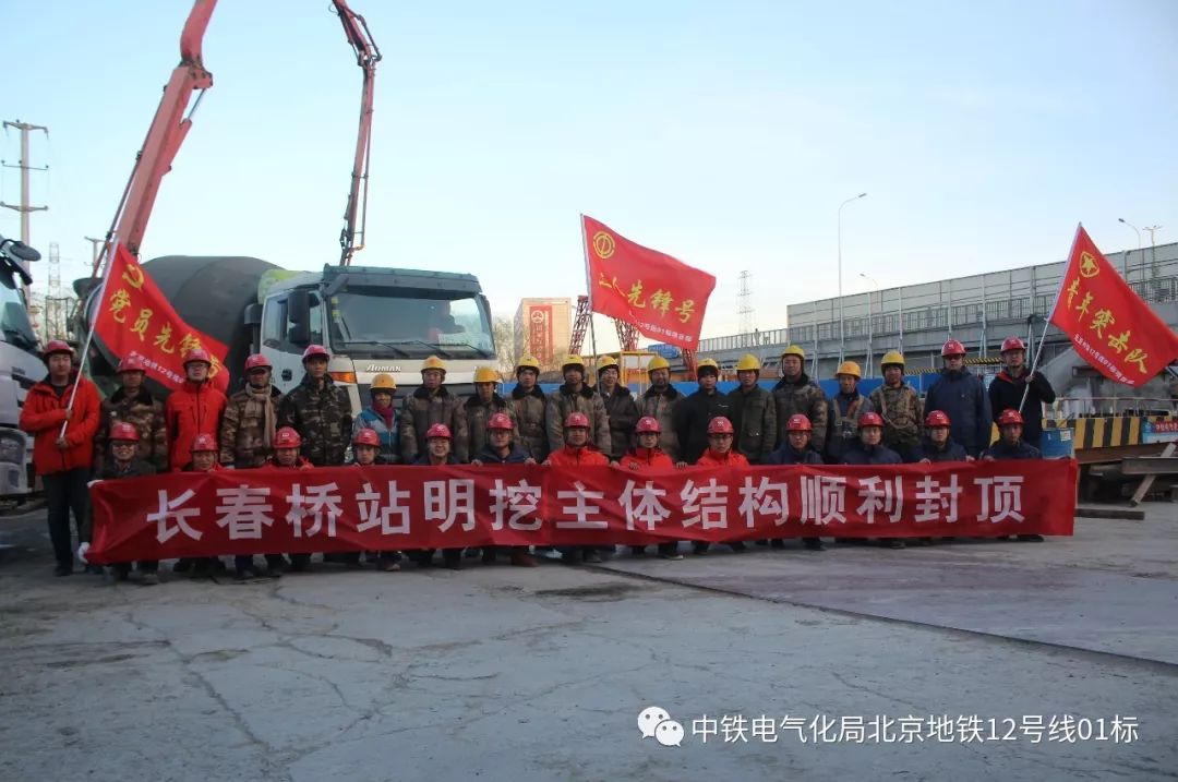 2019年1月8日18时12分,随着最后一车混凝土的顺利泵入,历经9个小时的430m³混凝土连续浇筑结束,标志着由中铁电气化局承建的北京地铁12号线长春桥站明挖主体结构顺利封顶,较1月15日节点工期提前了7天,这也是北京地铁12号线排名前列明挖结构主体封顶的车站。