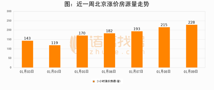 根据诸葛找房数据显示,北京24小时涨价房源量为228套,较01月08日增加13套,环比上涨6%。与此同时,涨价房源占比小幅扩大,业主信心有所提升。