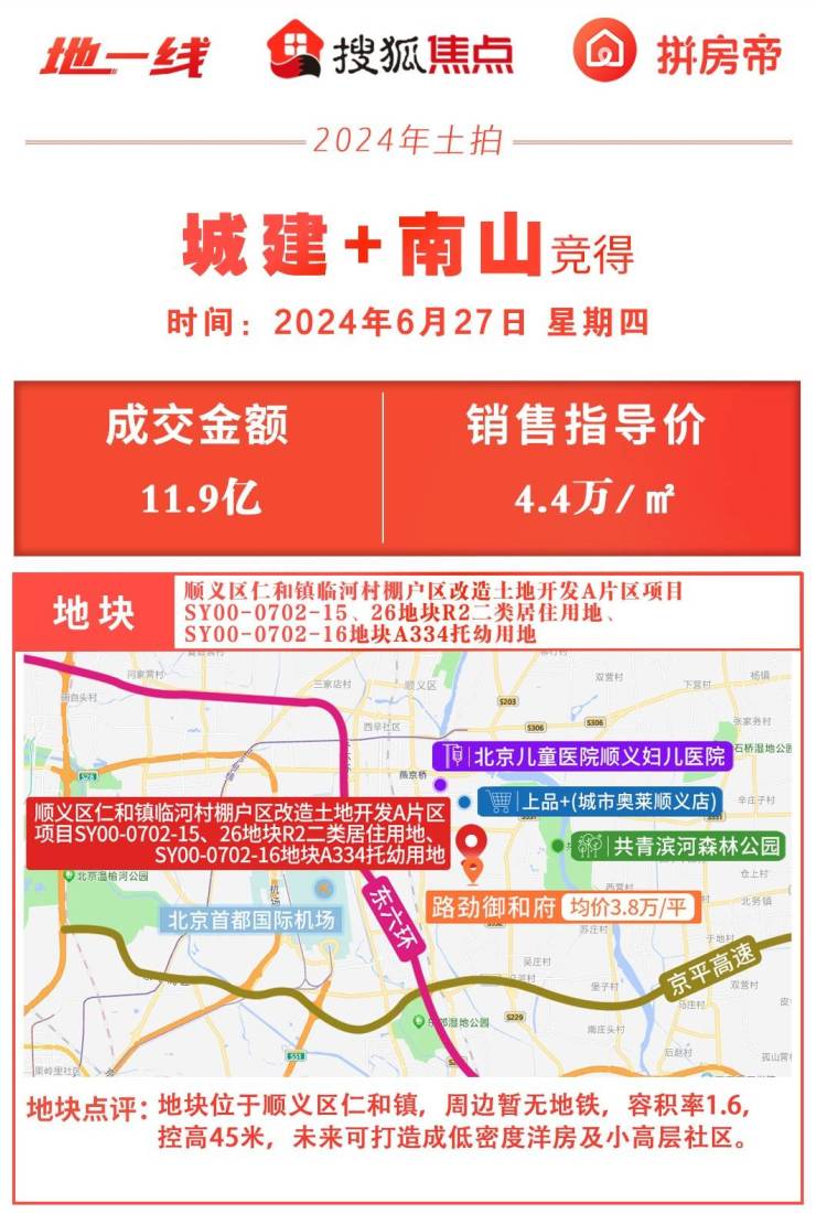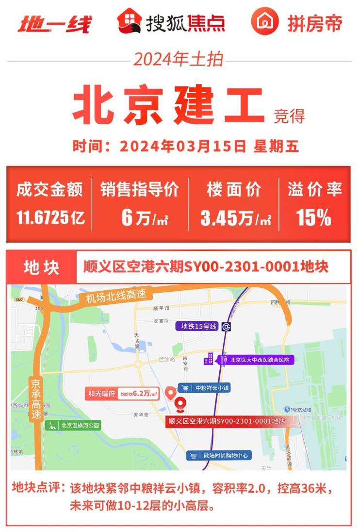 虽然上半年底价成交地块占比提升,导致土地市场热度较去年有所下降。不过,仍不乏抢手地块,热度最高的当属顺义空港六期地块,其在报价阶段就已触及价格上限,现场直接摇号确定竞得人,共有37家房企参与竞争。最终由北京建工幸运摇得,但在项目开发阶段与保利合作,即保利建工·星宸和煦。