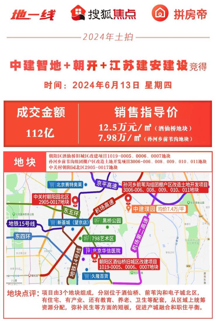 该宗地体量大、类型多元,由3个地块组成,涉及朝阳区北部酒仙桥、前苇沟、电子城三个重点区域。其中,酒仙桥宅地销售指导价12.5万元/平方米、前苇沟宅地销售指导价7.98万元/平方米。超10万元/平方米的销售指导价也令其成为上半年指导价格最高的地块。