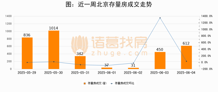 从存量房来看,2025年06月04日北京存量房单日成交612套,比昨日增加162套,环比上涨36%。从近一周存量房成交来看,北京存量房日均成交套数为474套,06月04日单日成交612套,高于近一周平均水平29.1%。