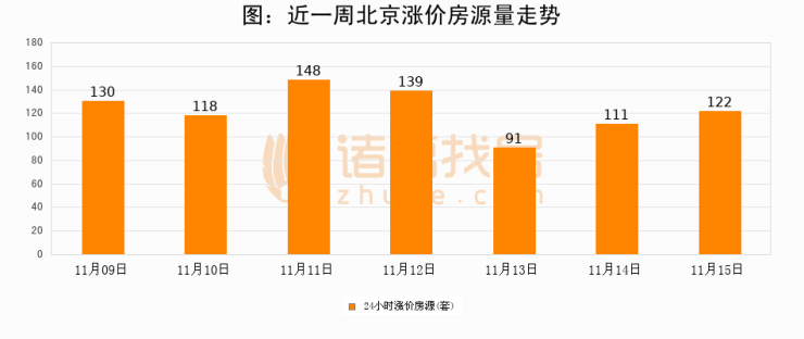 根据诸葛找房数据显示,北京24小时涨价房源量为122套,较11月14日增加11套,环比上涨9.9%。与此同时,涨价房源占比小幅扩大,业主信心有所提升。