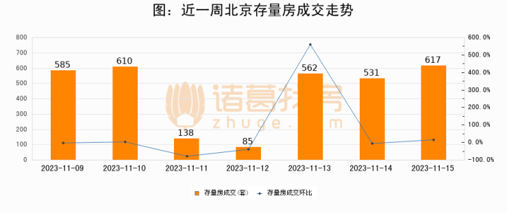 从存量房来看,2023年11月15日北京存量房单日成交617套,比昨日增加86套,环比上涨16.2%。从近一周存量房成交来看,北京存量房日均成交套数为446套,11月15日单日成交617套,高于近一周平均水平38.3%。