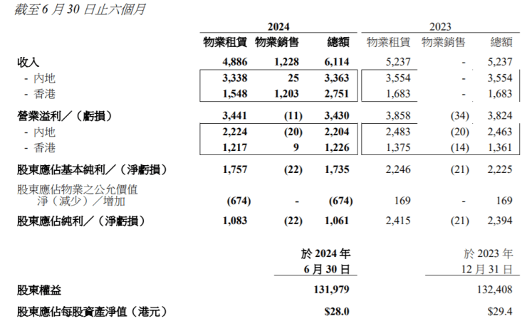 《每日经济新闻》记者注意到,恒隆地产上半年录得净利润约为10.61亿港元,同比下跌约55.72%;股东应占纯利润为17.35亿港元,同比下跌22%。另外,恒隆地产此前宣布将于2024年9月25日派发截至2024年6月30日止6个月的中期股息每股0.12港元,较去年同期减少33.33%。