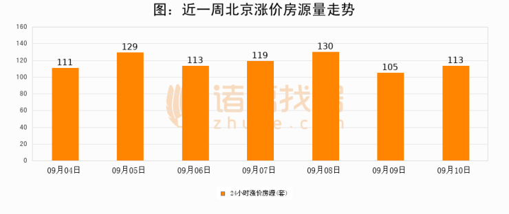 根据诸葛找房数据显示,北京24小时涨价房源量为113套,较09月09日增加8套,环比上涨7.6%。与此同时,涨价房源占比小幅扩大,业主信心有所提升。