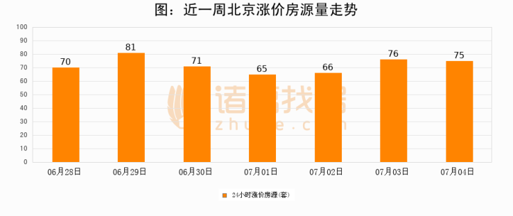 根据诸葛找房数据显示,北京24小时涨价房源量为75套,较07月03日减少1套,环比下降1.3%。与此同时,涨价房源占比小幅回落,对于购房者来说是一个入市窗口期,购房者可抓住时机入市。