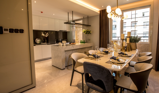 U型厨房,提升了空间利用率;冰藏区、烹饪区、小家电区、洗涤区和多功能储物操作区,既整合又分离布局,将收纳做到大而有序;同时折叠玻璃门,让厨房在开敞与封闭之间自由切换,实现中西厨的双重体验。整体看,135-166㎡楼王户型,功能齐备、设计巧妙、宽敞舒适,在区域内并不多见。且现房实景的优势及超高性价比亦实属难得。