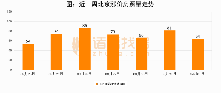 根据诸葛找房数据显示,北京24小时涨价房源量为64套,较08月31日减少17套,环比下降21%。与此同时,涨价房源占比小幅回落,对于购房者来说是一个入市窗口期,购房者可抓住时机入市。