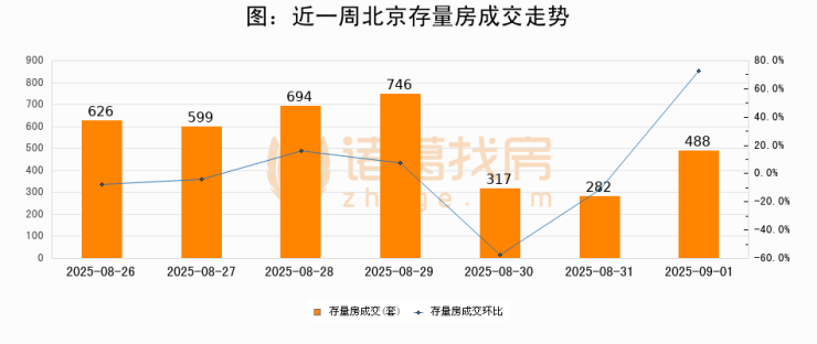 从存量房来看,2025年09月01日北京存量房单日成交488套,比昨日增加206套,环比上涨73%。从近一周存量房成交来看,北京存量房日均成交套数为536套,09月01日单日成交488套,低于近一周平均水平9%。