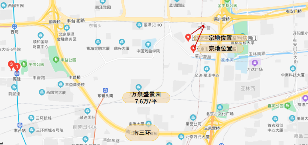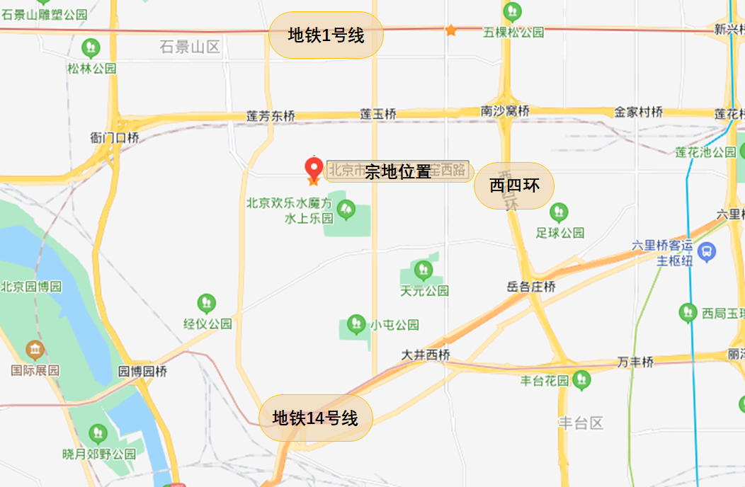 宗地位于三四环之间,宗地内区域较散,涵盖居住、教育和绿隔产业用地;4公里内涵盖3个地铁站,且毗邻地铁泥洼站。