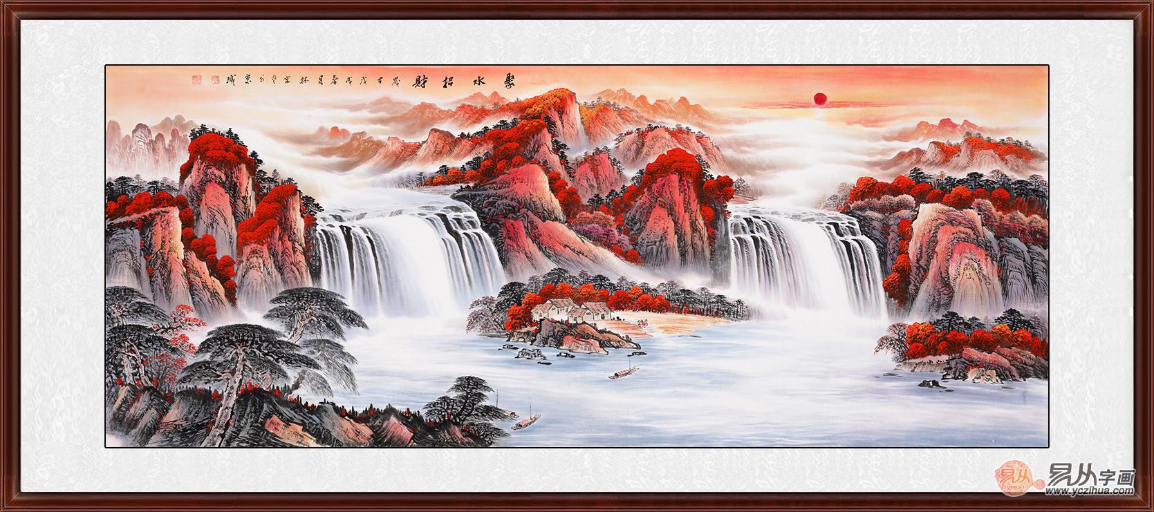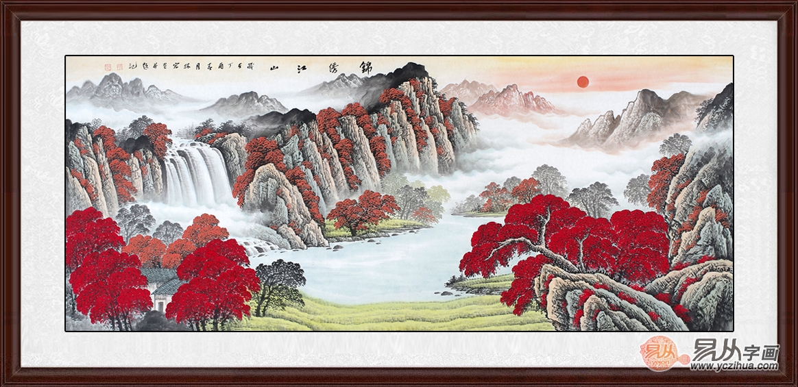 此幅李林宏老师的《聚水招财》图,画中漫山遍野红云漫卷,初升的朝阳将红色光芒倾洒山河,两侧的瀑布气势浩大,寓意财源不绝,源远流长,左右逢源,山势绵延,预示着画的主人前程远大、潜力无限,是客厅艺术和风水共存的装饰画优选!