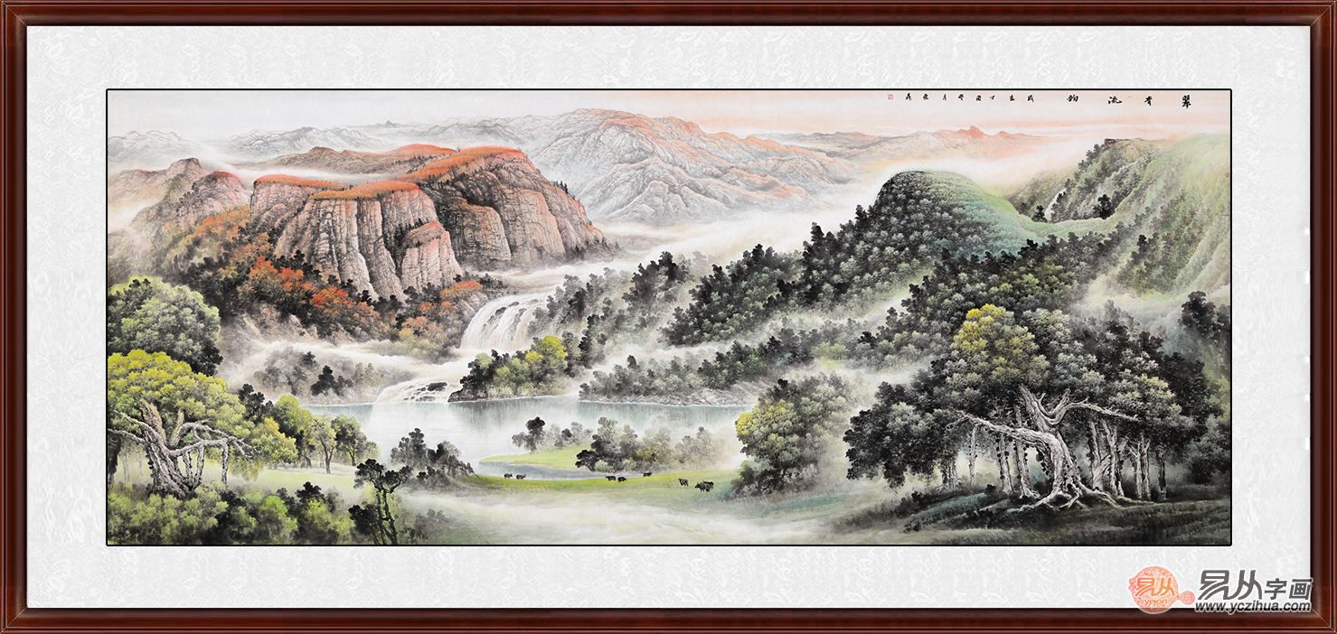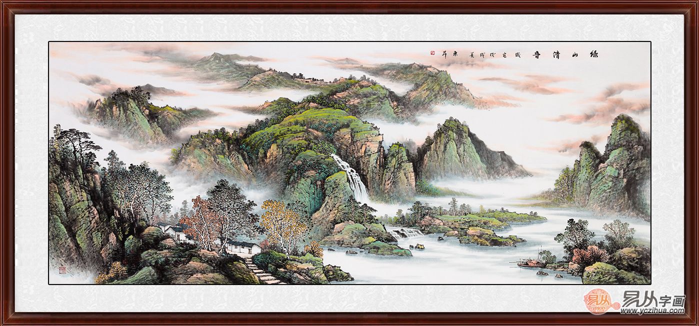 山水装饰画,涵义丰富、呈祥纳瑞,深受人们的喜爱,山水画构图不只深谙风水学原理,而且十分美观、大方,挂在家中客厅里有着十分不错的装饰作用。试想一下,于钢筋水泥之中,置一青山绿水、诗意盎然的山水画,足不出户,纵享自然风光的旖旎瑰丽,沏一壶普洱清茶,抚须静坐,必将是人生一大快事!