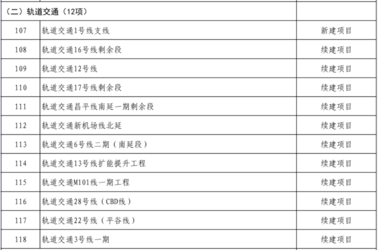 其中,将新建1号线支线;续建16号线剩余段、12号线、17号线剩余段、昌平线南延一期剩余段、新机场线北延、6号线二期(南延段)、13号线扩能提升工程、M101线一期、28号线(CBD线)、22号线(平谷线)、3号线一期。