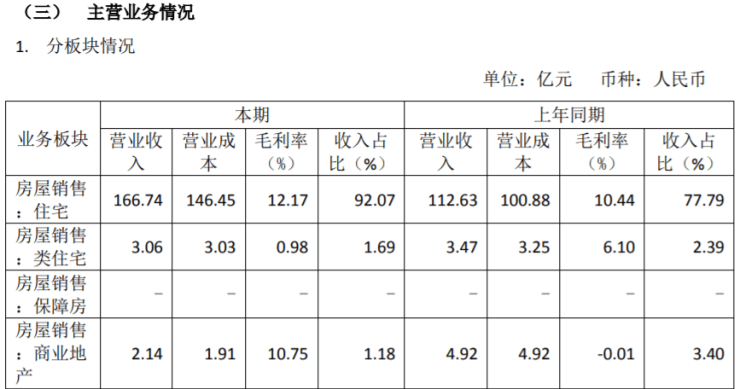 住宅销售是中国铁建地产的主要收入来源。报告期内,公司共计实现销售收入166.74亿元,占总收入的92.07%,毛利率12.17%。