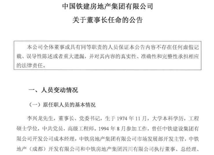 9月9日,中国铁建地产发布关于董事长任命的公告,李兴龙因工作变动原因不再担任公司董事长、党委书记职务,由孙洪军接任。
