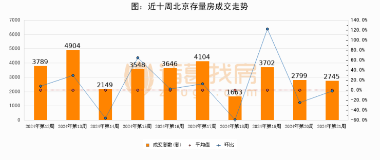 存量房方面,第21周北京存量房成交2745套,较上周减少54套,环比下降1.9%。从近十周成交走势来看,周均成交套数为3304套,本周低于平均水平16.9%。