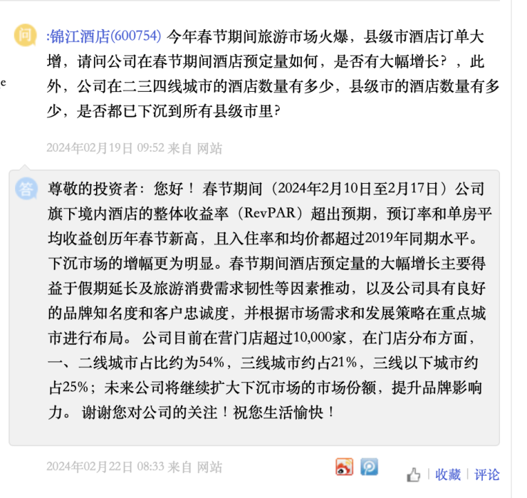 锦江酒店对此回复称:“春节期间(2024年2月10日至2月17日)公司旗下境内酒店的整体收益率(RevPAR)超出预期,预订率和单房平均收益创历年春节新高,且入住率和均价都超过2019年同期水平。”