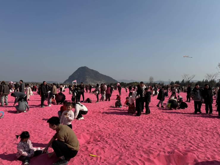 春节期间,澎湃新闻在浙江省台州市某景点看到,平日里并不热闹的海边游人如织,沙滩外围的一圈撑起了一顶顶帐篷,海滩中围起来的“粉色沙滩”满是游客。